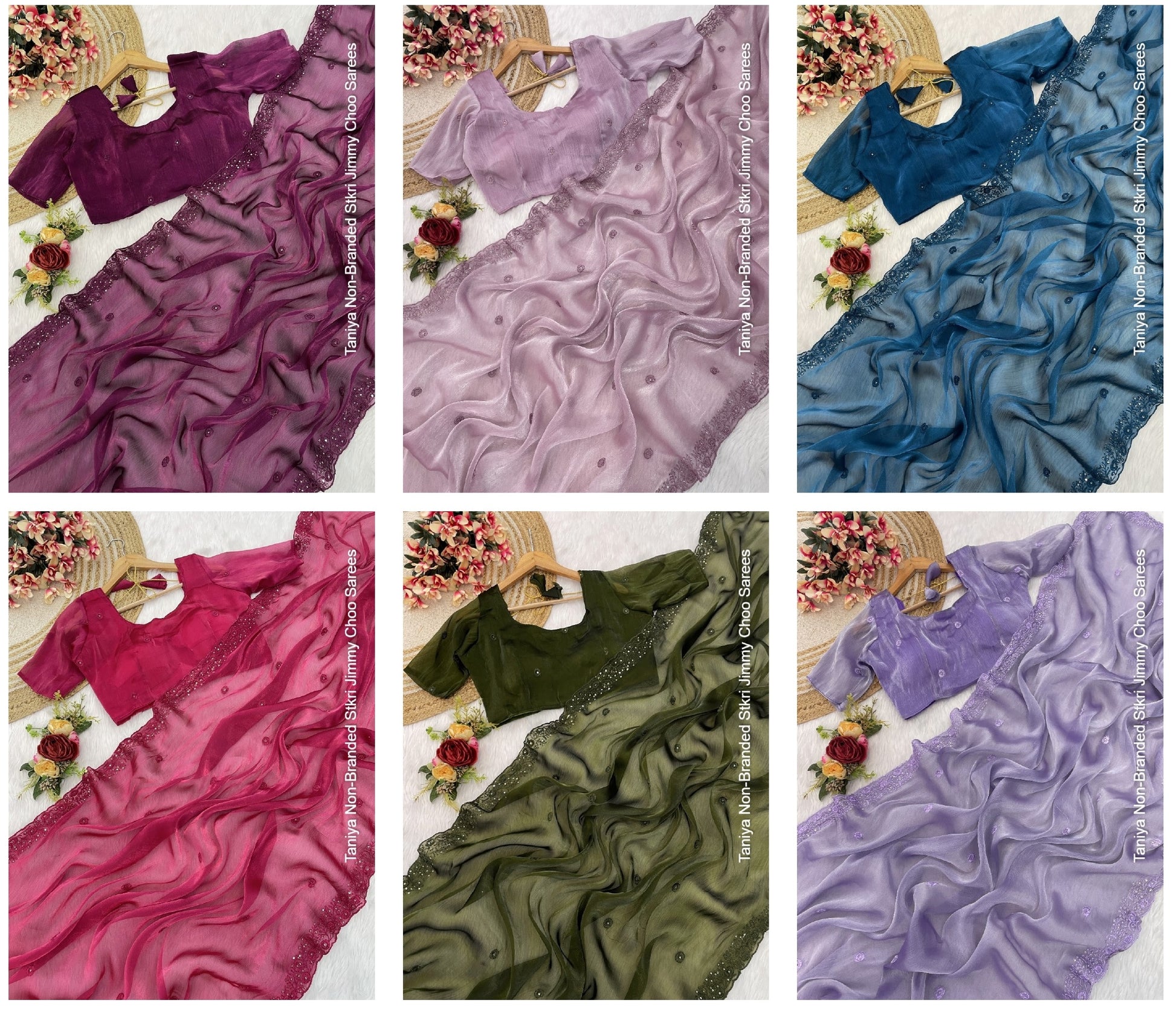 - Fabric Detail: Saree : Pure Soft Zimmy Choo Silk With Amazing 3 Mm Sequence Work With Cut Work Border , Blouse : Paired With Full Stitched Zimmy Chhoo Embroidery Work With Latkan Full Stiched, ,