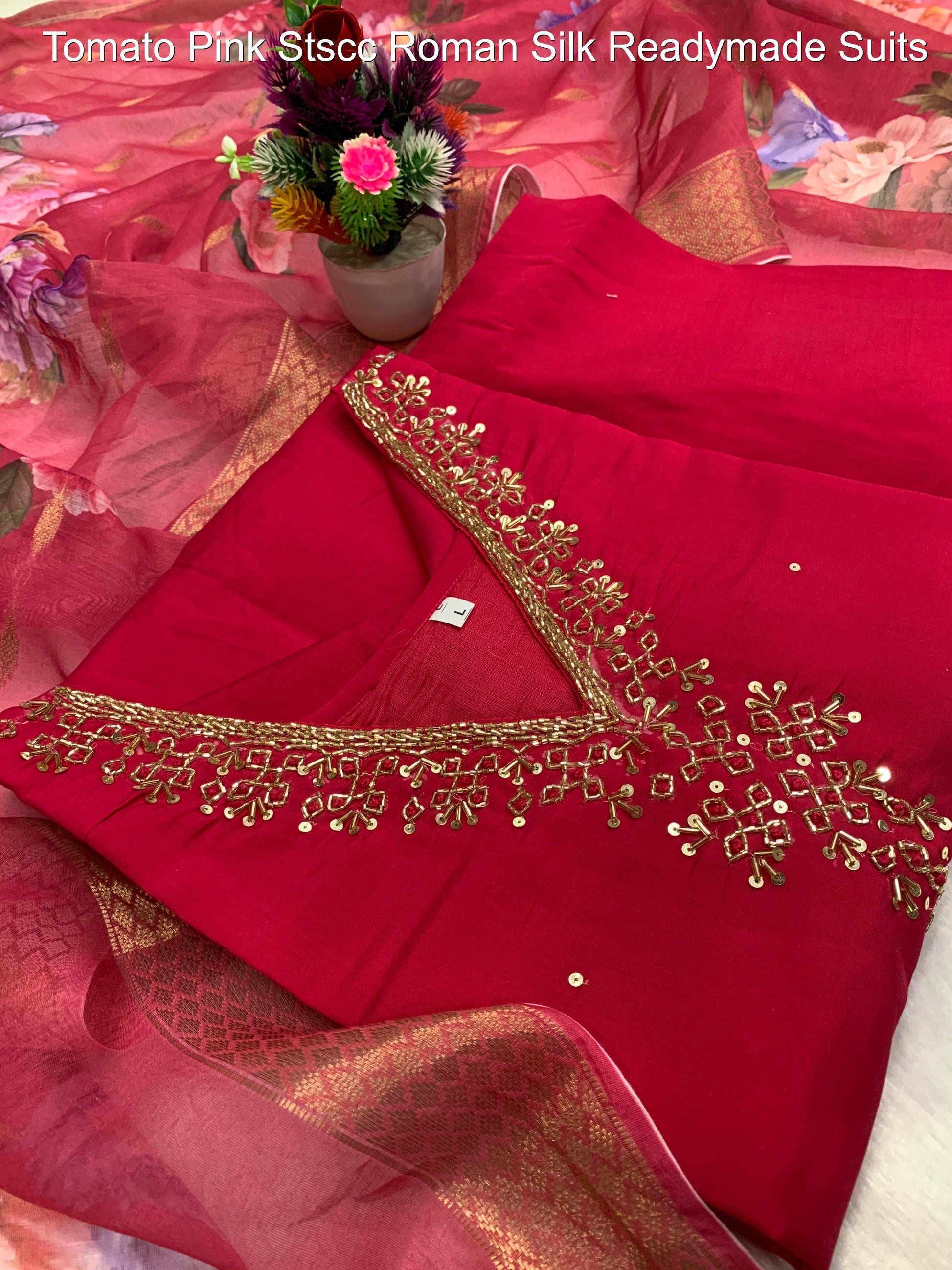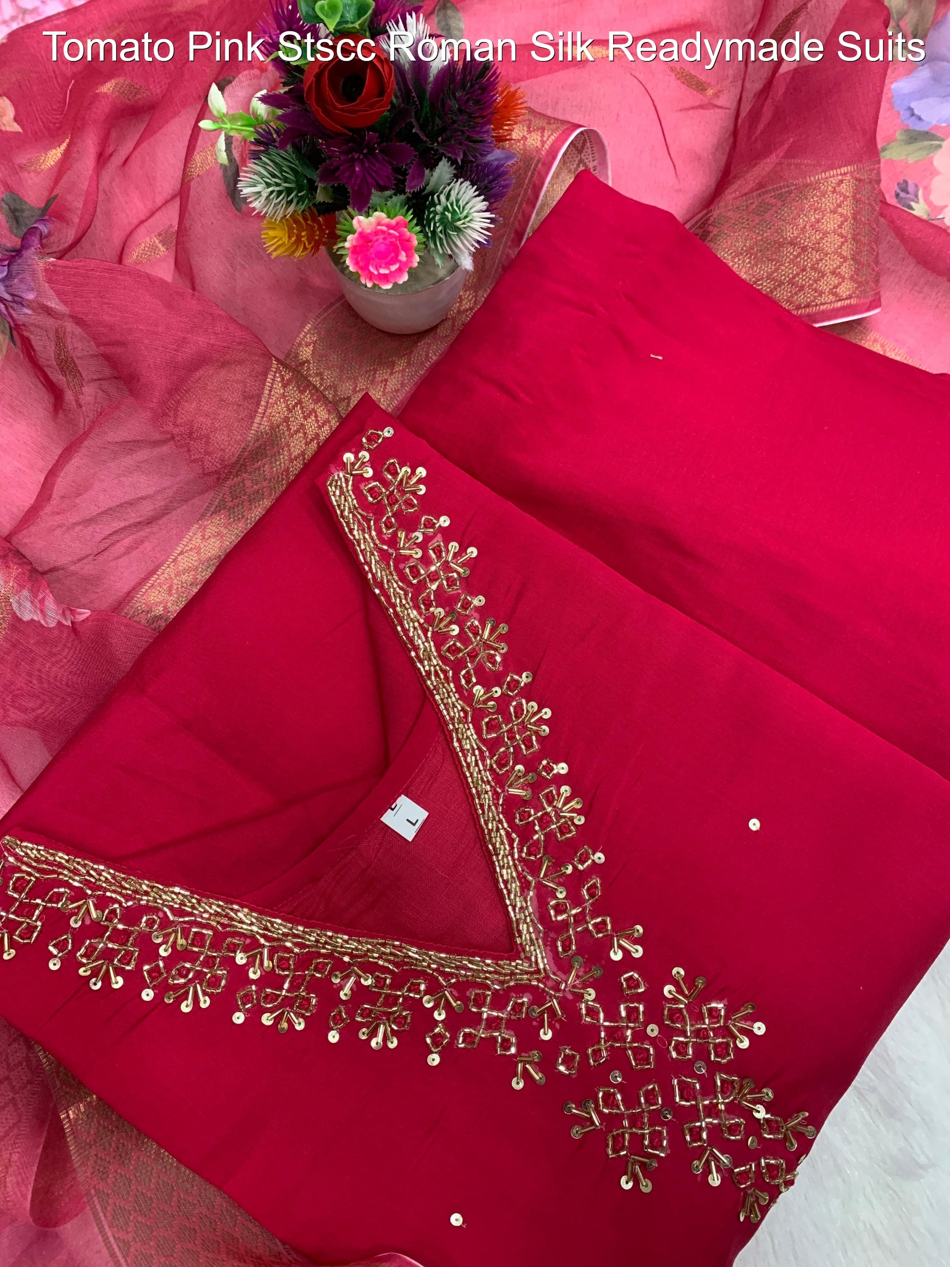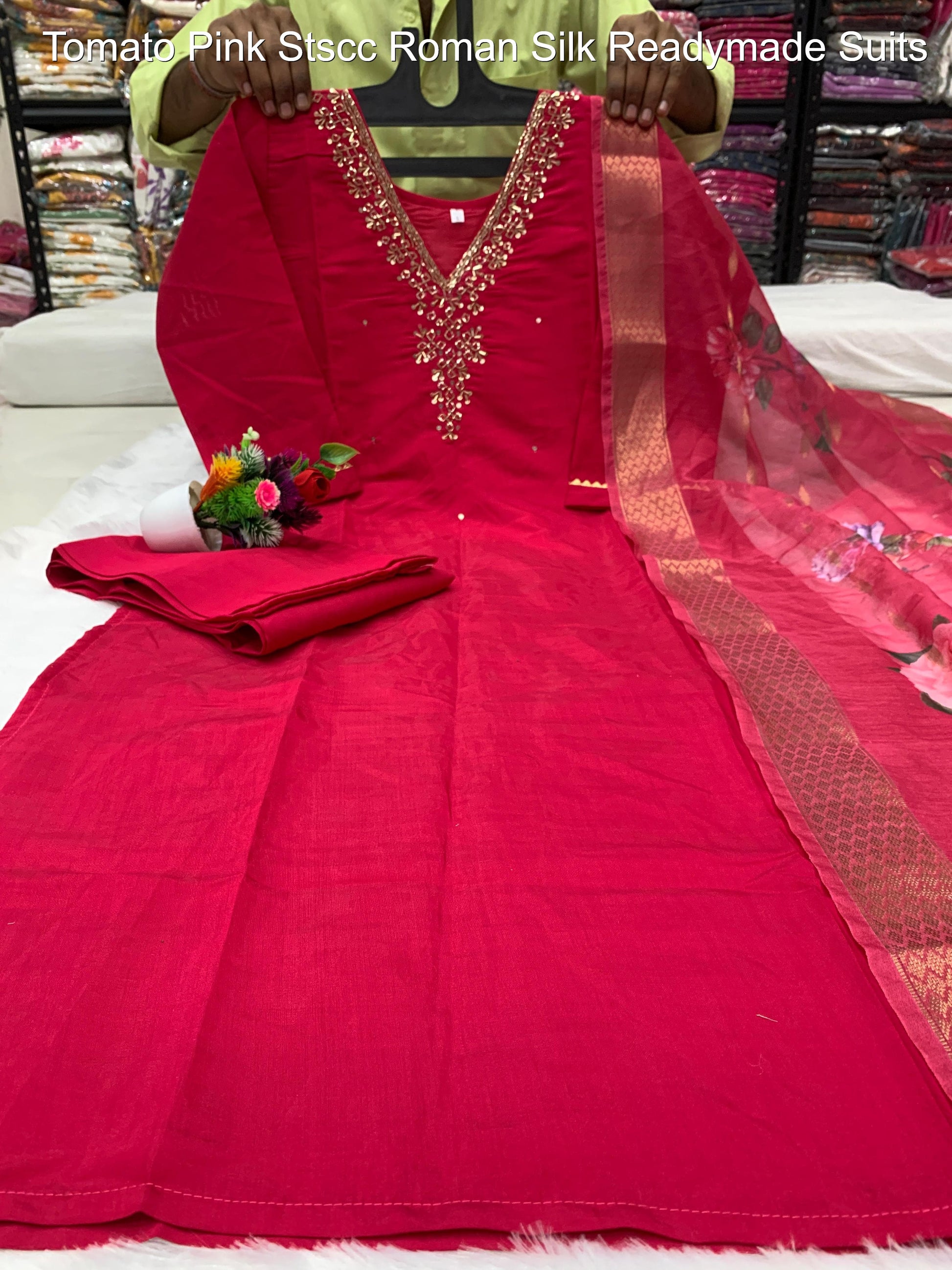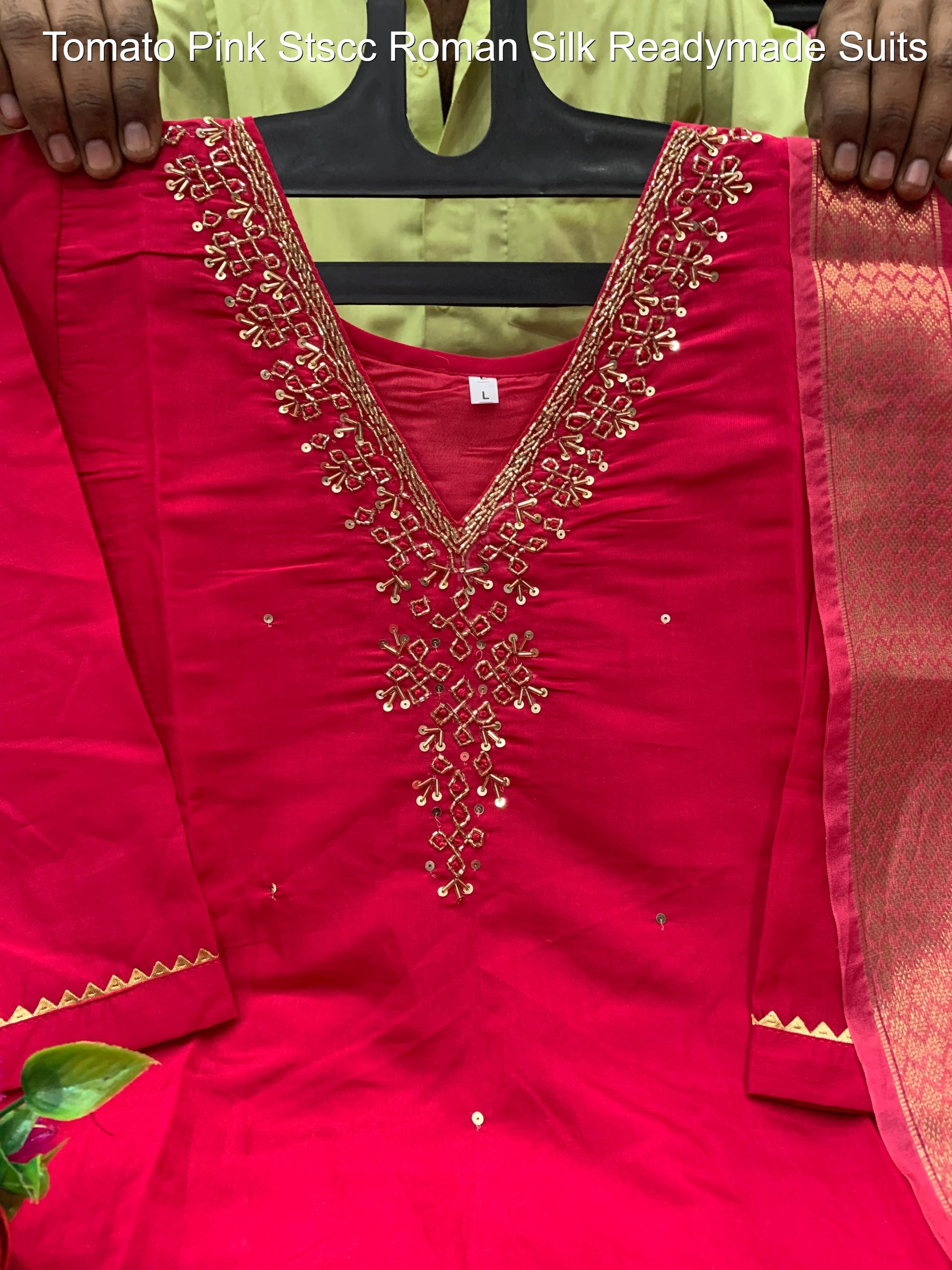 Tomato Pink Stscc Roman Silk Readymade Suits