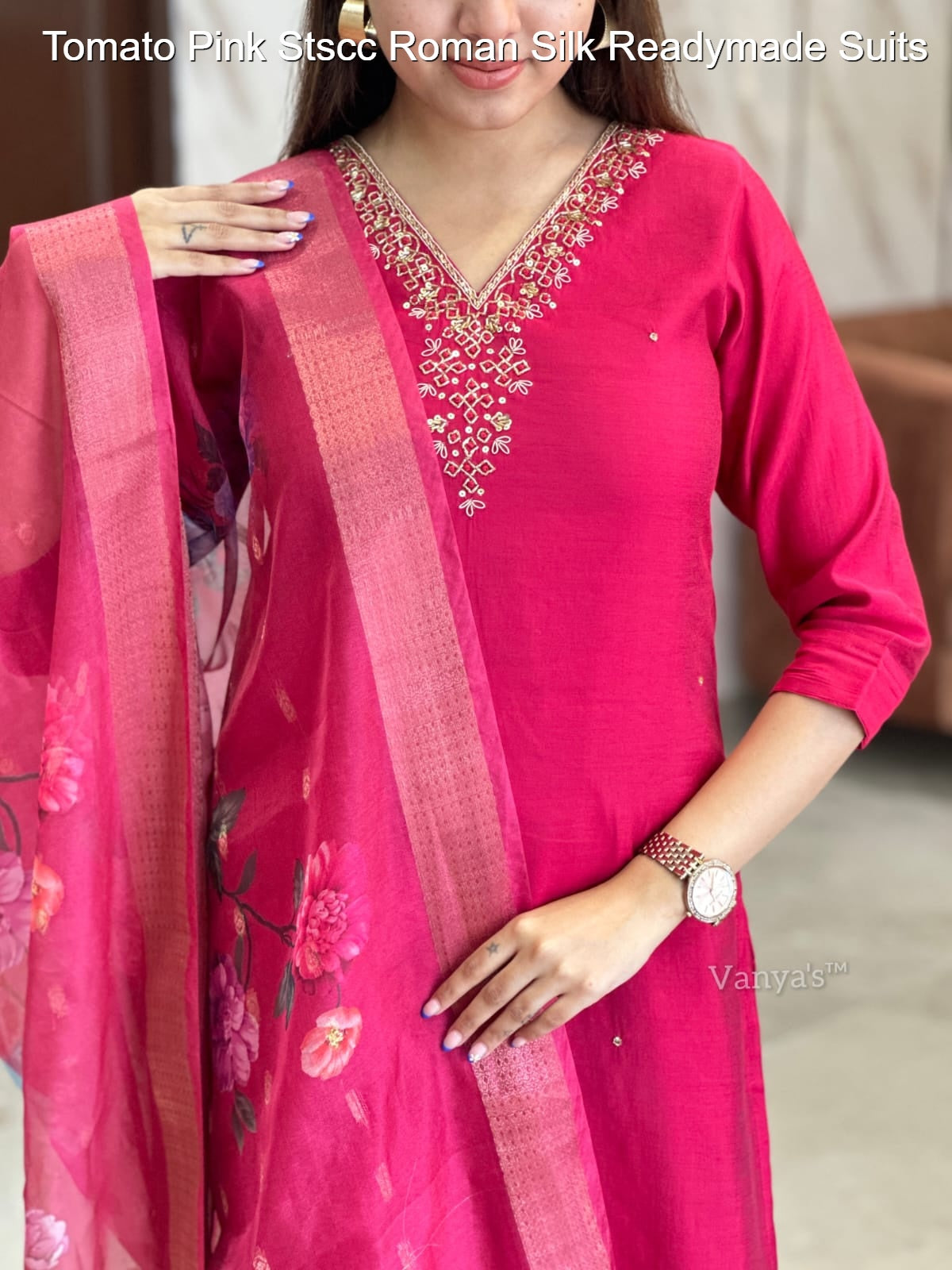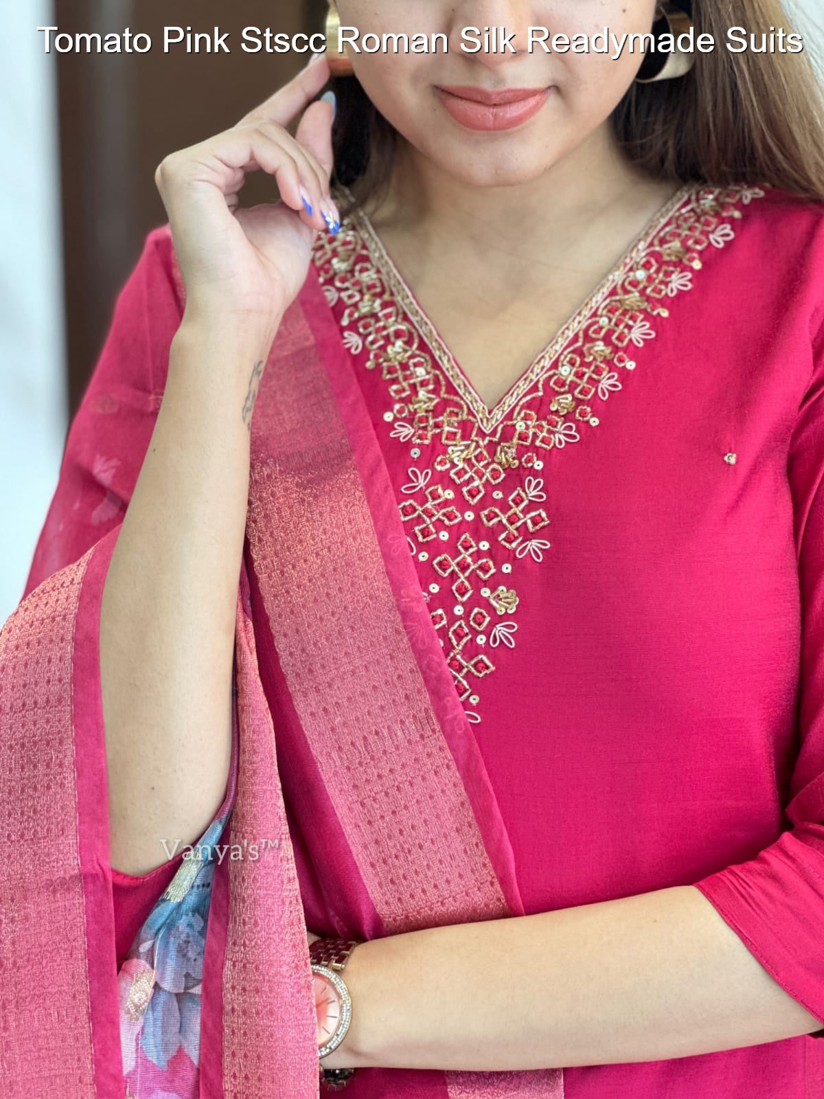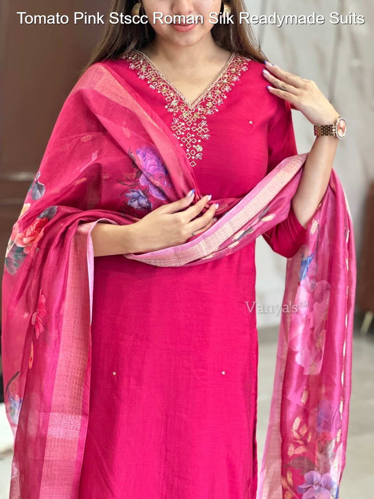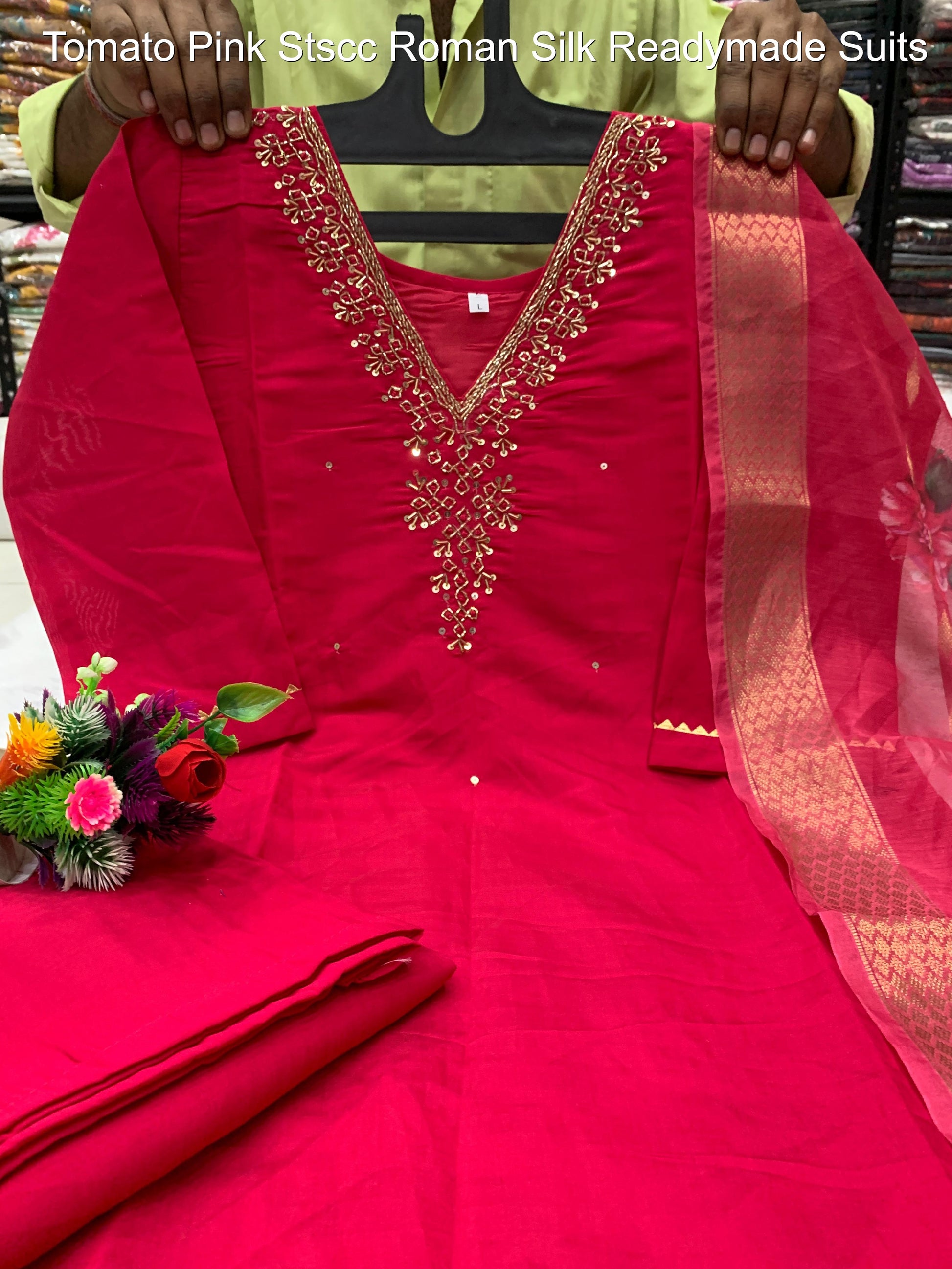 Tomato Pink Stscc Roman Silk Readymade Suits