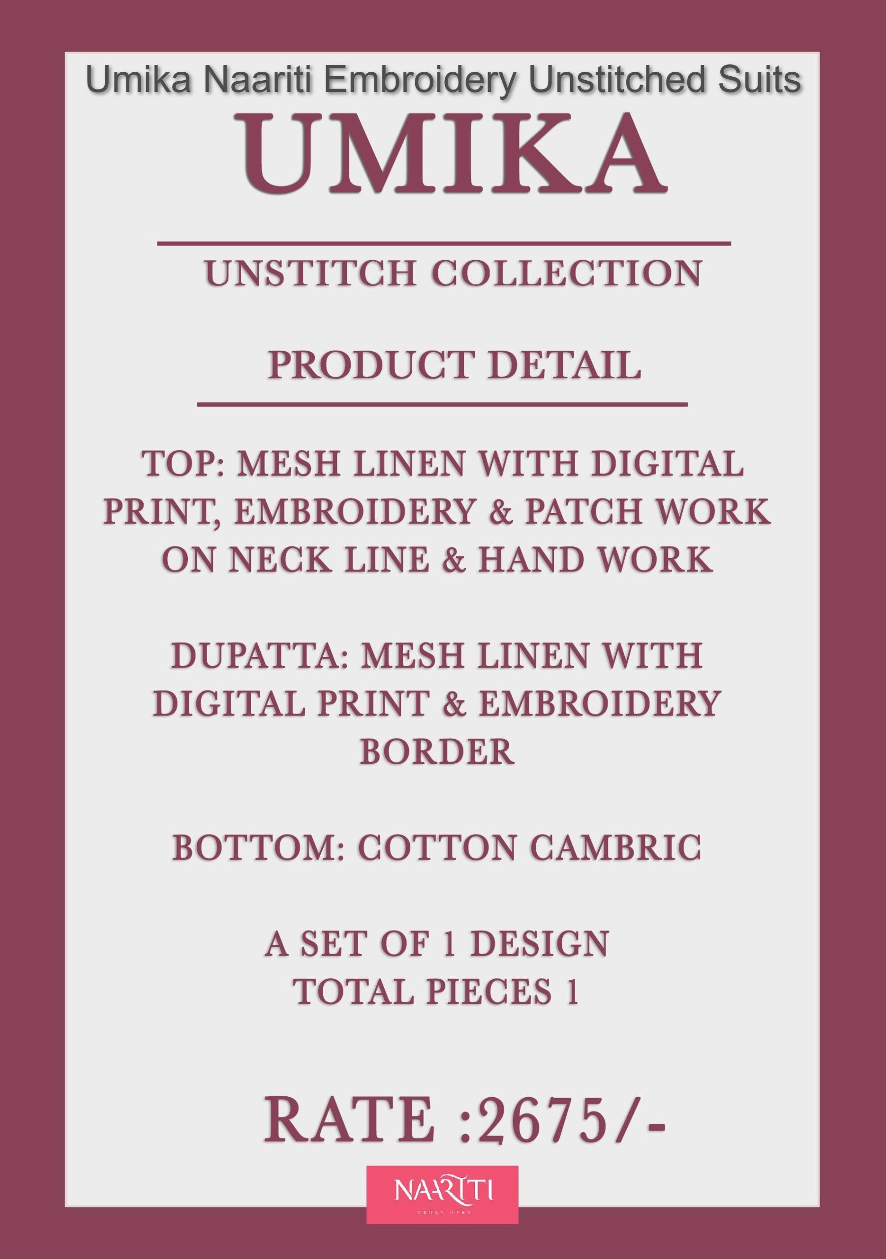 - Umika Naariti Embroidery Unstitched Suits Dealer Ahmedabad Surat Wholesale Gujarat India Lowest Price Best Quality Buy Purchase Shipping Kurta Salwaar Kameez Also free Cash on delivery