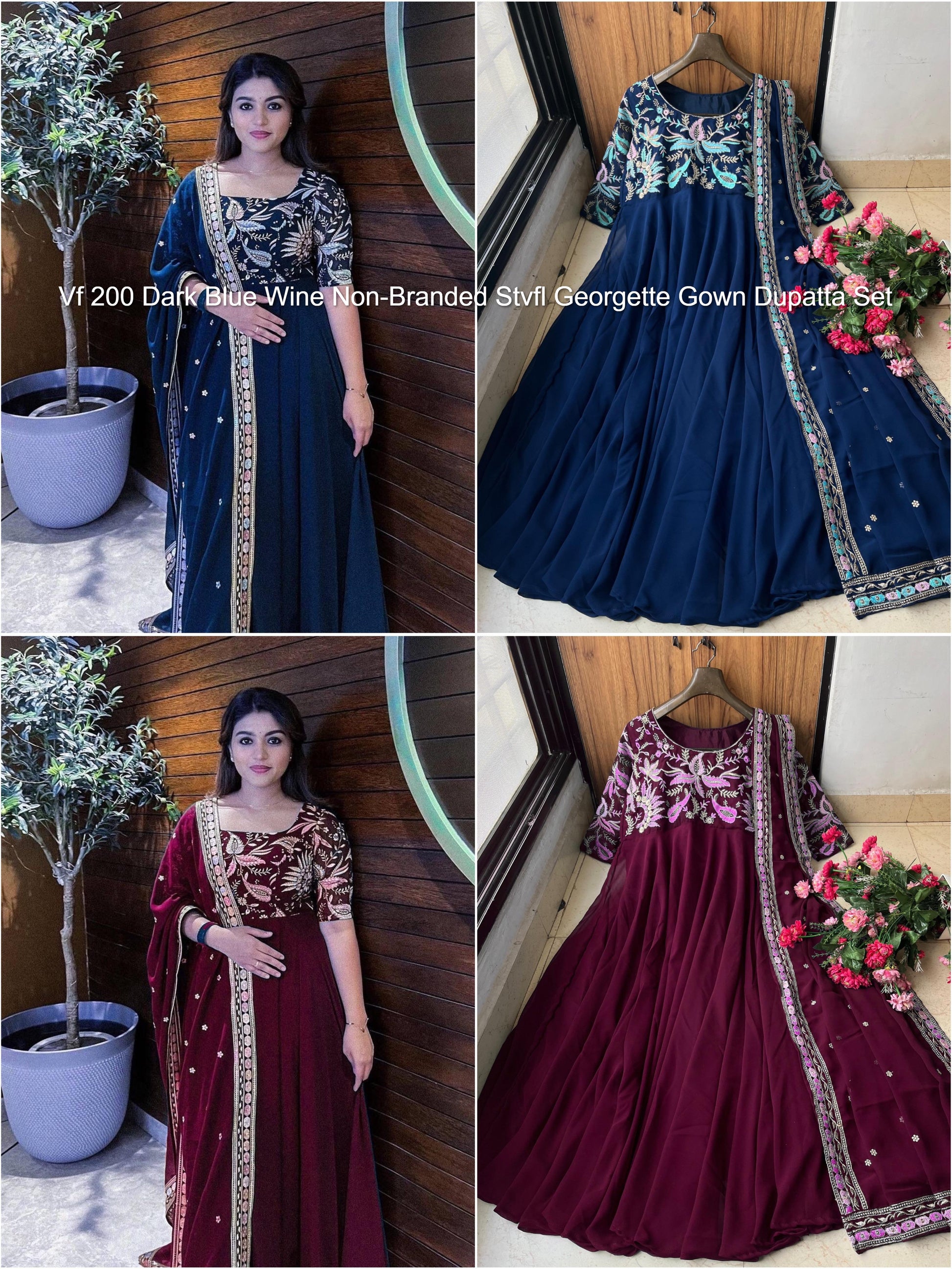 - Vf 200 Dark Blue Wine Non-Branded Stvfl Georgette Gown Dupatta Set Dealer Ahmedabad Surat Wholesale Gujarat India Lowest Price Best Quality Buy Purchase Shipping Kurta Salwaar Kameez Also free Cash on delivery
