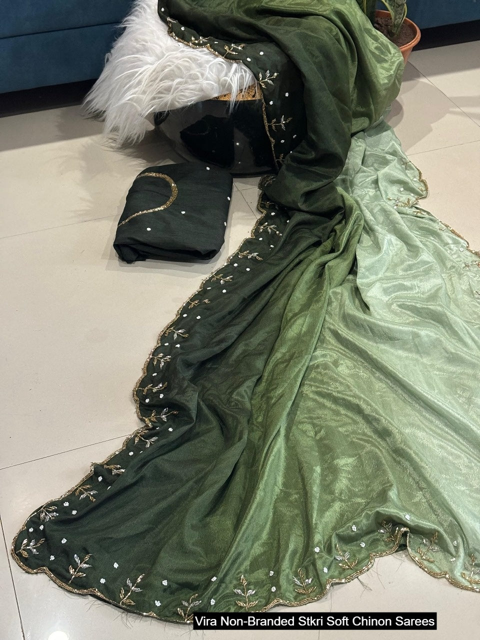 - Fabric Detail: Saree : Pure Soft Chinon Peding Rich Cut Dana And Moti Flowers Handwork Borders , Blouse : Paired With Running With Cut Dana And Moti Flowers Handwork , ,