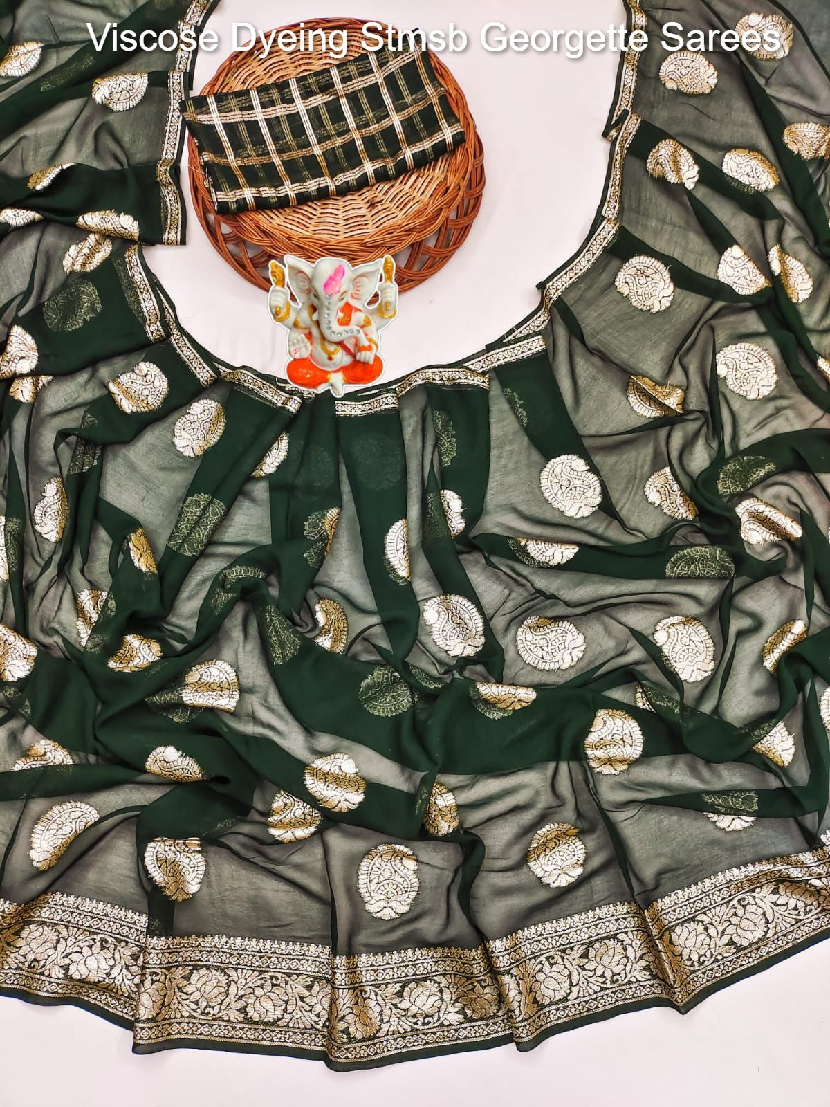 - Fabric Detail: Saree : Pure Viscsose Georgette Dyeing With Weaving Border All Over Zari Work , Blouse : Running Embroidery , ,
