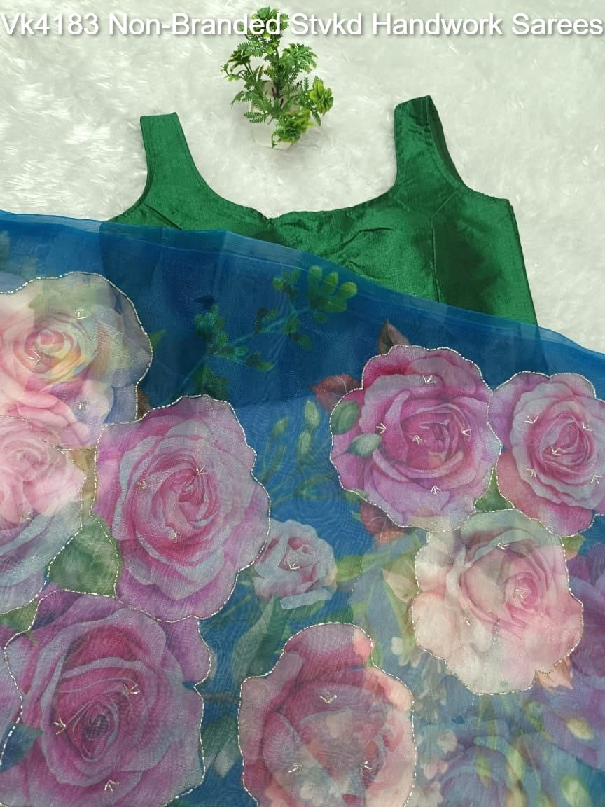 - Fabric Detail: Saree : Soft Pure Organza Handwork Digital Print Khatli, Blouse : Bangalory Satin,Unstich, ,