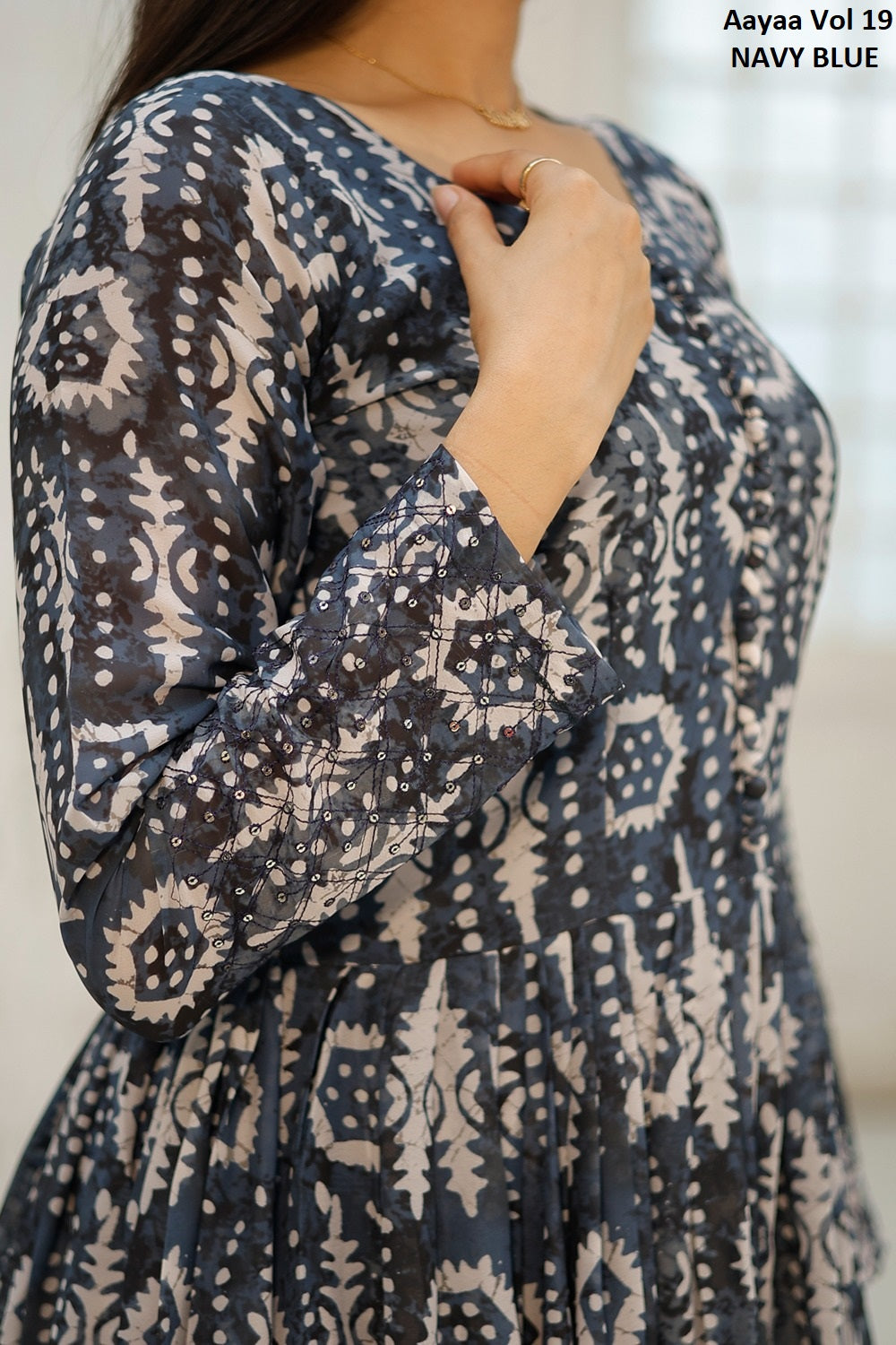 - Vol 19 Navy Blue Aayaa Georgette One Piece Gown Dealer Ahmedabad Surat Wholesale Gujarat India Lowest Price Best Quality Buy Purchase Shipping Kurta Salwaar Kameez Also free Cash on delivery