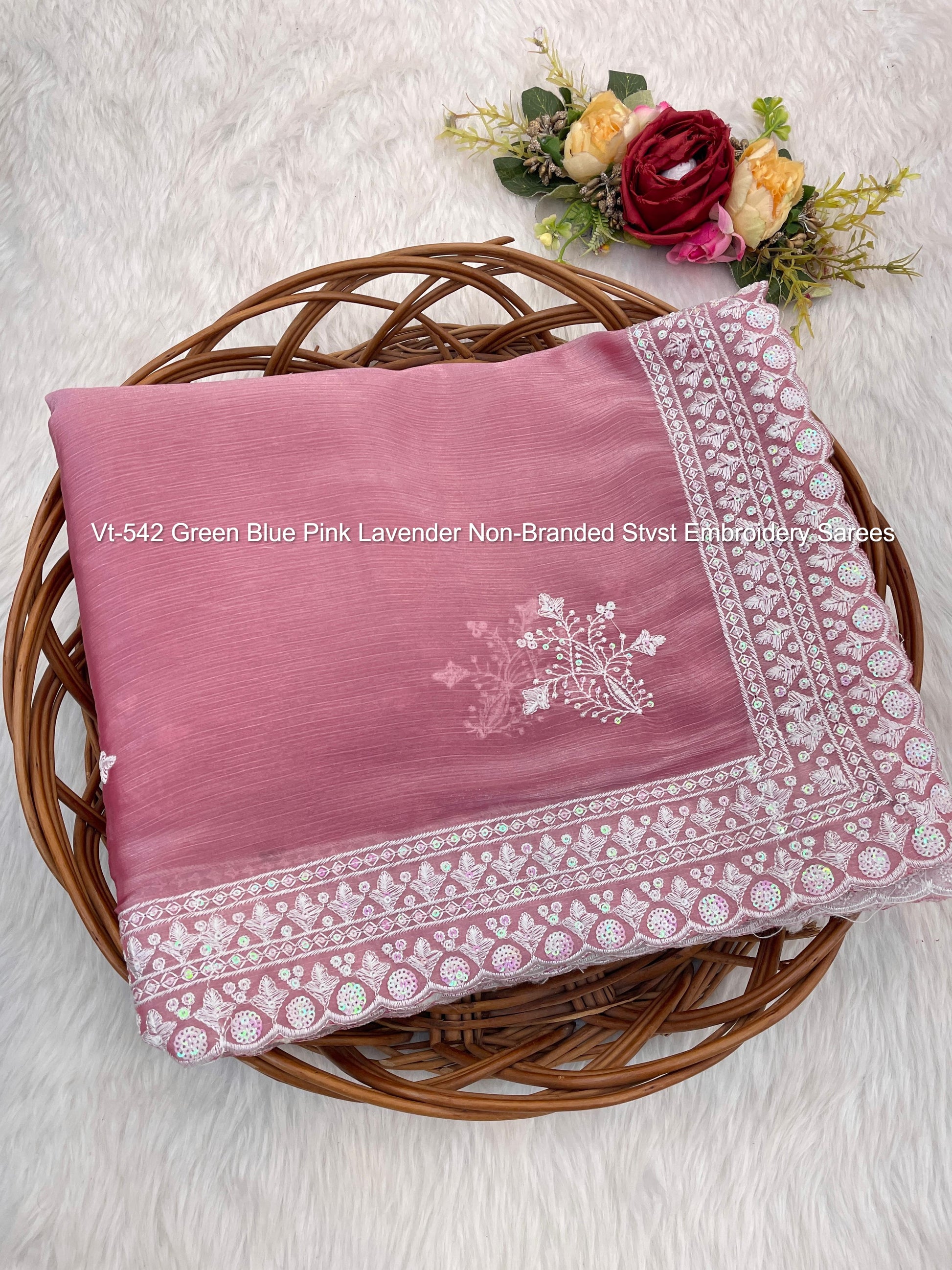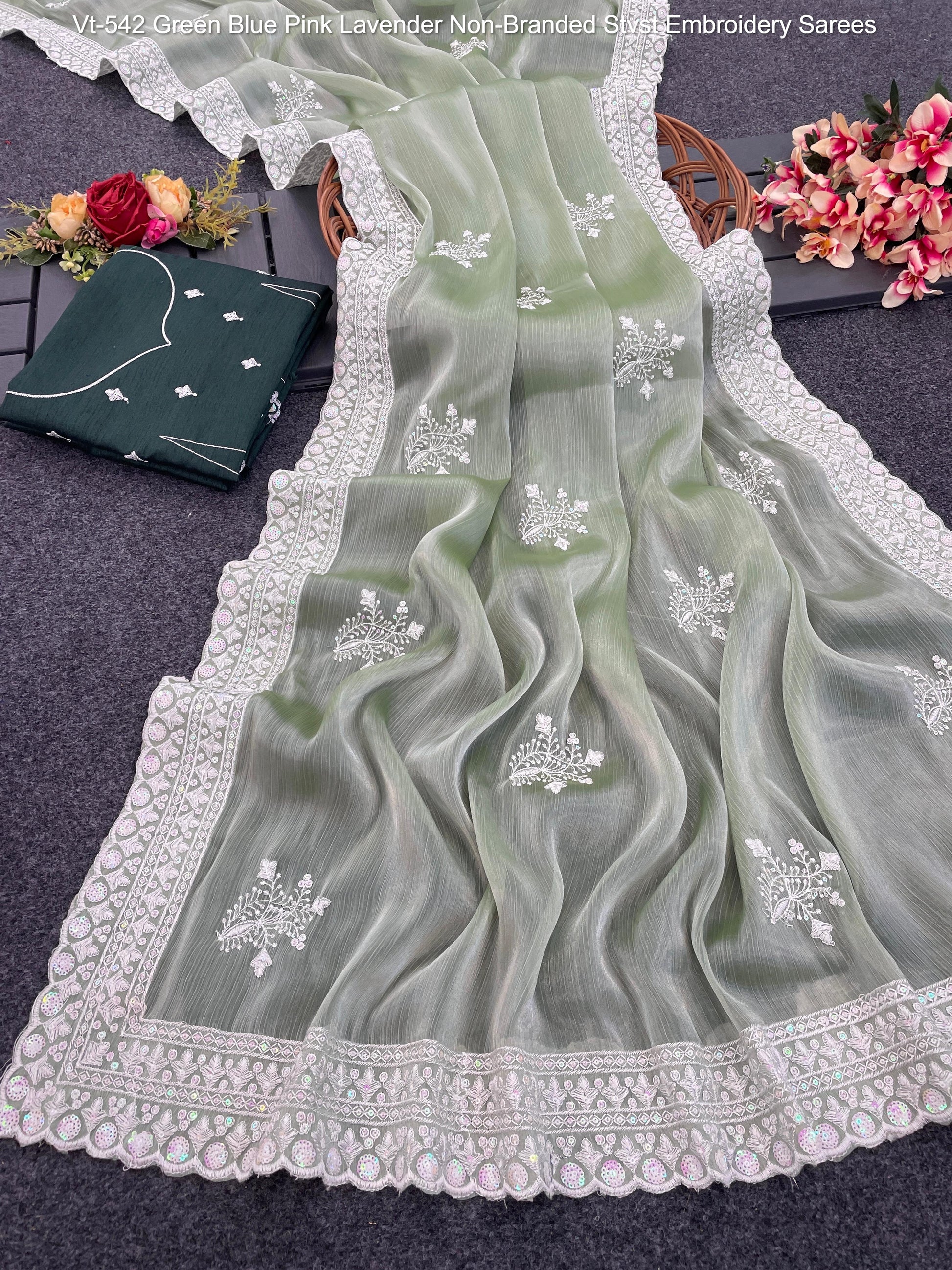 Vt-542 Green Blue Pink Lavender Non-Branded Stvst Embroidery Sarees