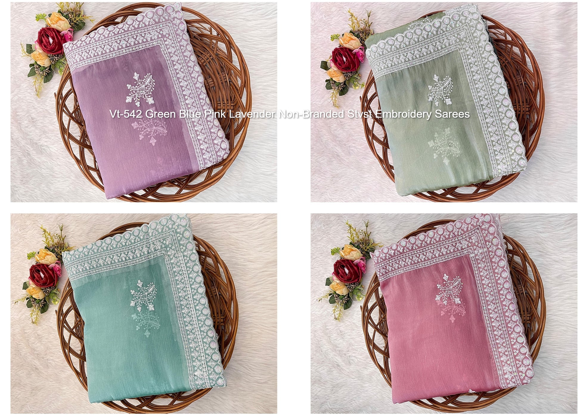 - Vt-542 Green Blue Pink Lavender Non-Branded Stvst Embroidery Sarees Dealer Ahmedabad Surat Wholesale Gujarat India Lowest Price Best Quality Buy Purchase Shipping Kurta Salwaar Kameez Also free Cash on delivery