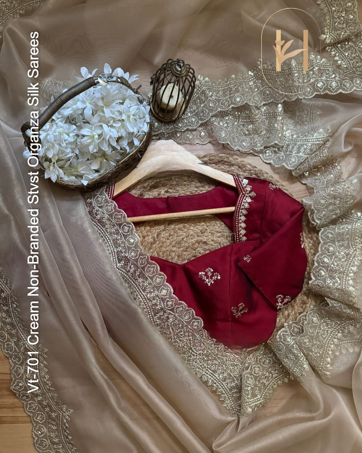 Vt-701 Cream Non-Branded Stvst Organza Silk Sarees