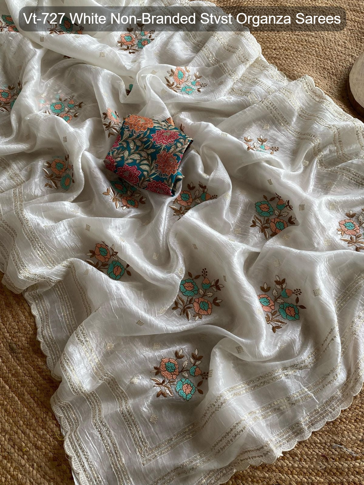 Vt-727 White Non-Branded Stvst Organza Sarees