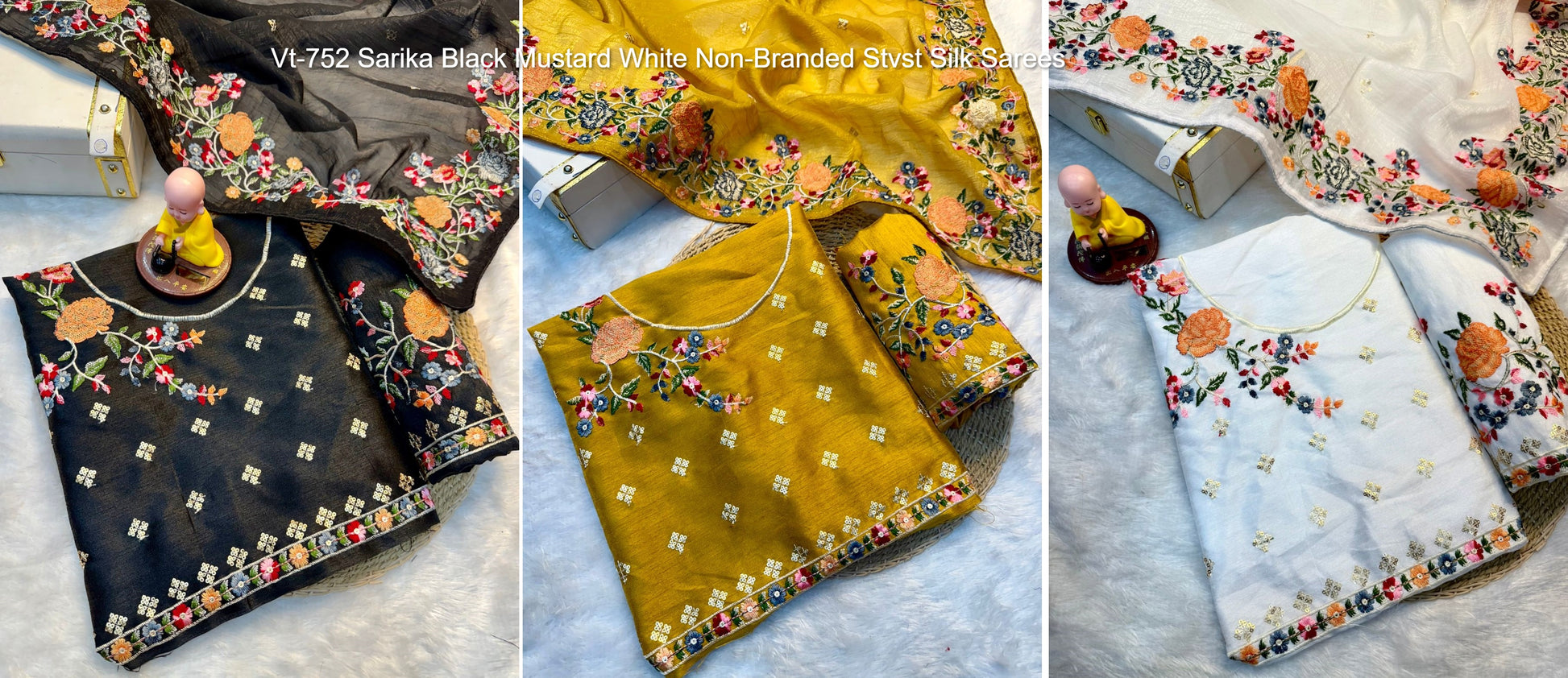 - Vt-752 Sarika Black Mustard White Non-Branded Stvst Silk Sarees Dealer Ahmedabad Surat Wholesale Gujarat India Lowest Price Best Quality Buy Purchase Shipping Kurta Salwaar Kameez Also free Cash on delivery