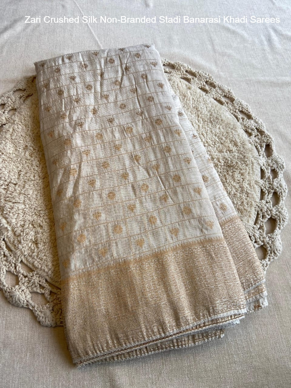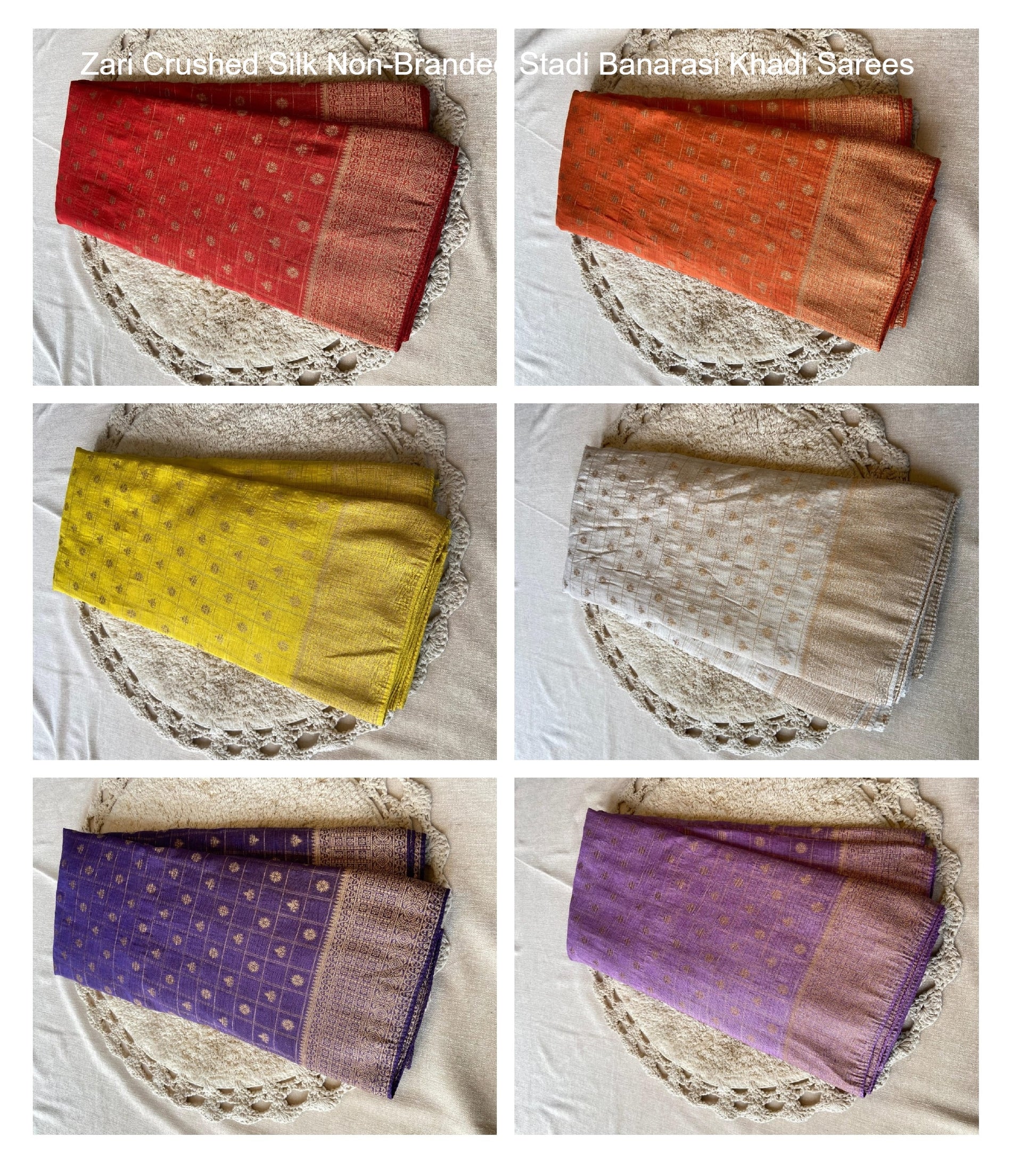 - Fabric Detail: Saree : Pure Soft Banarasi Khadi Zari Crushed Silk Weaving With Finest Zari Wooven Pallu With Fancy Tassels With Check Butti Weaving, Blouse : Running Barcode Butti, Color : Red,Yellow,White,Violet,Purple,Orange,