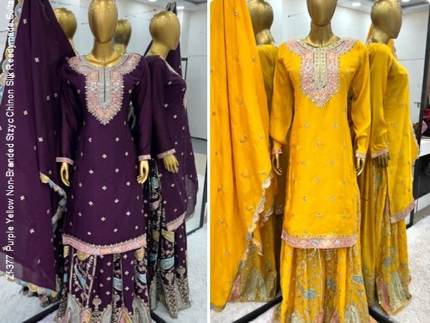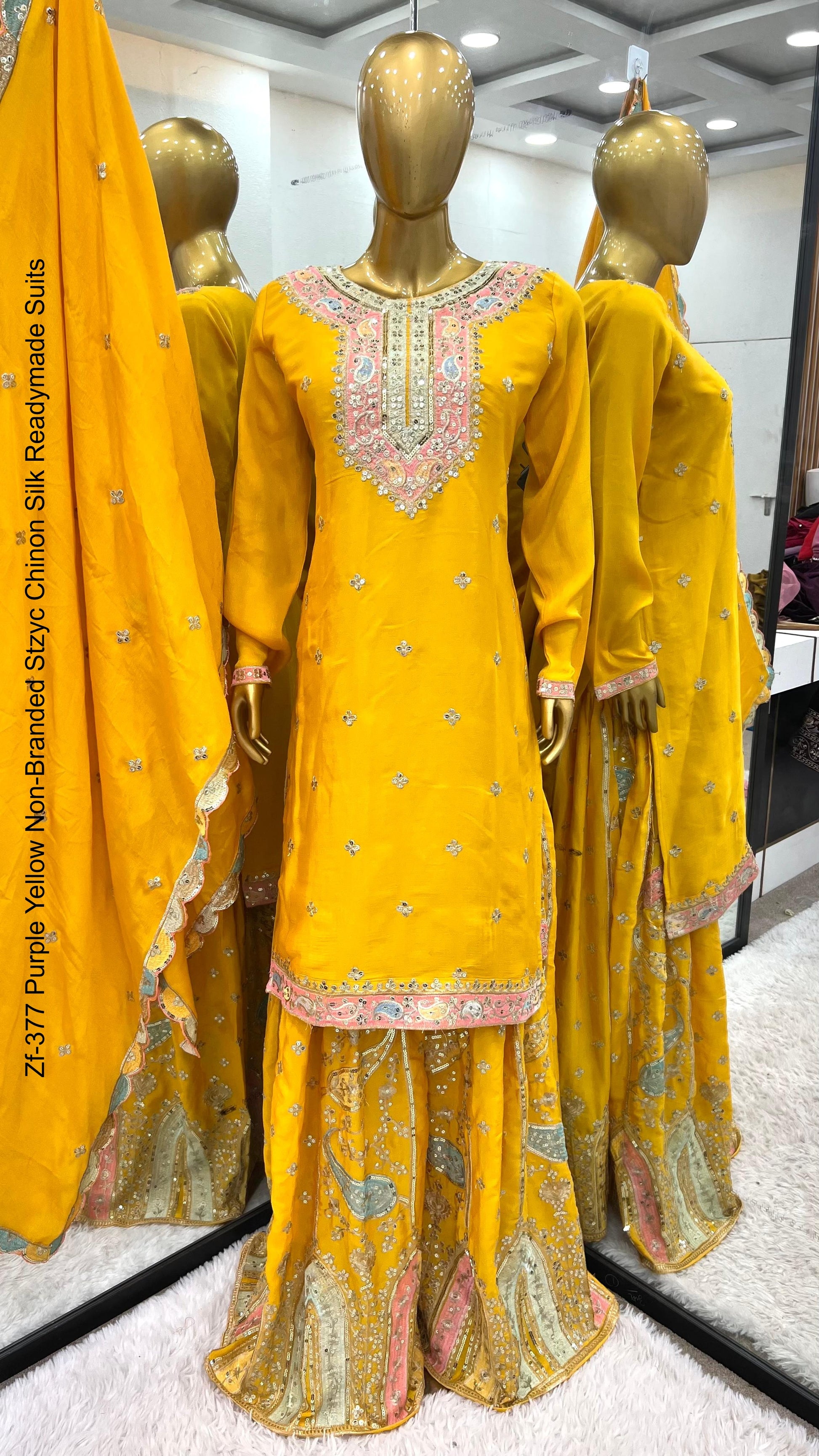 Zf-377 Purple Yellow Non-Branded Stzyc Chinon Silk Readymade Suits