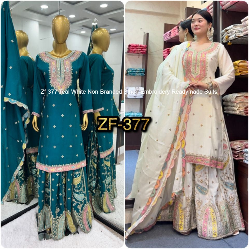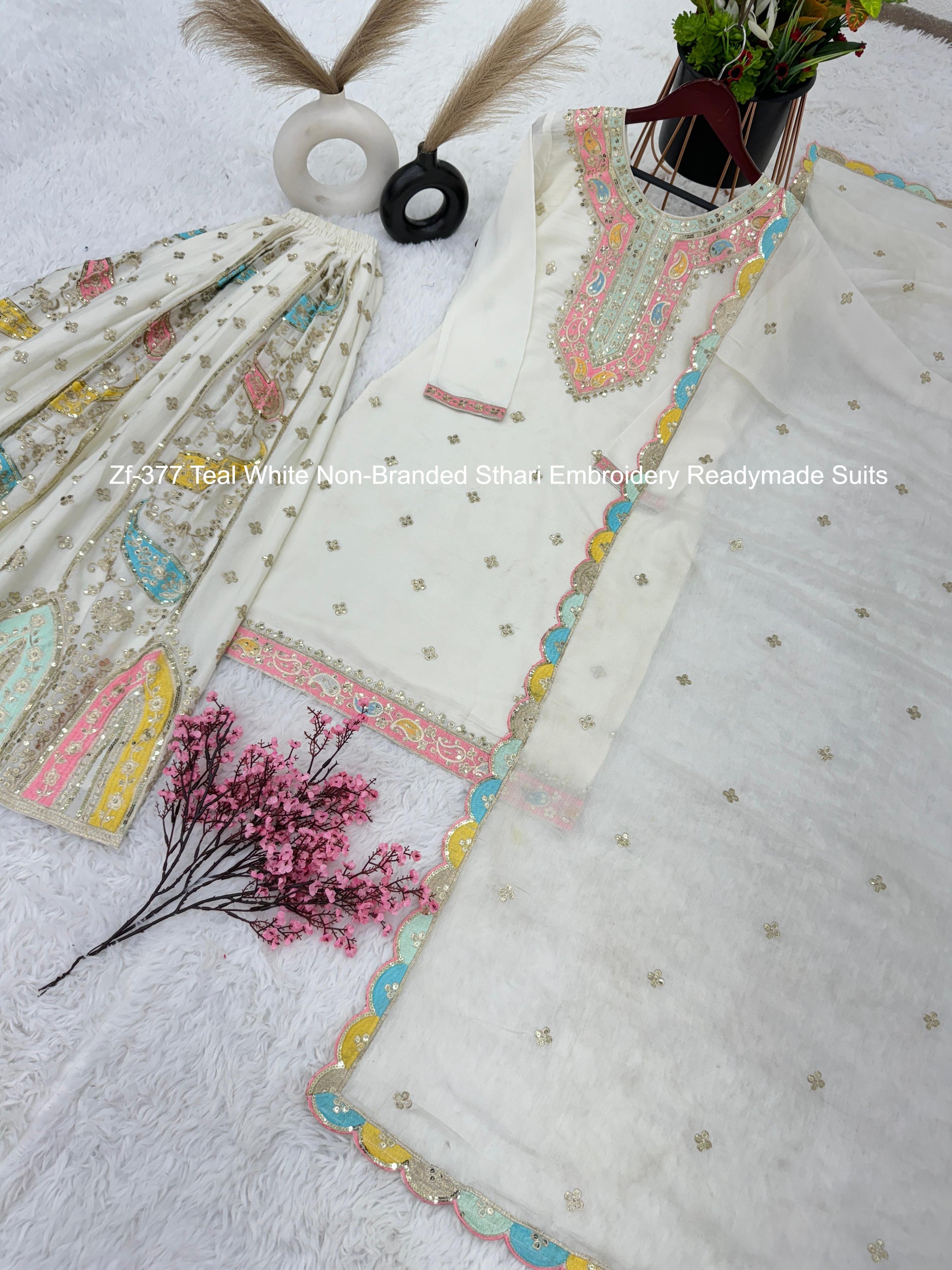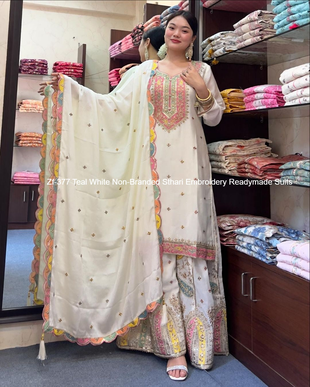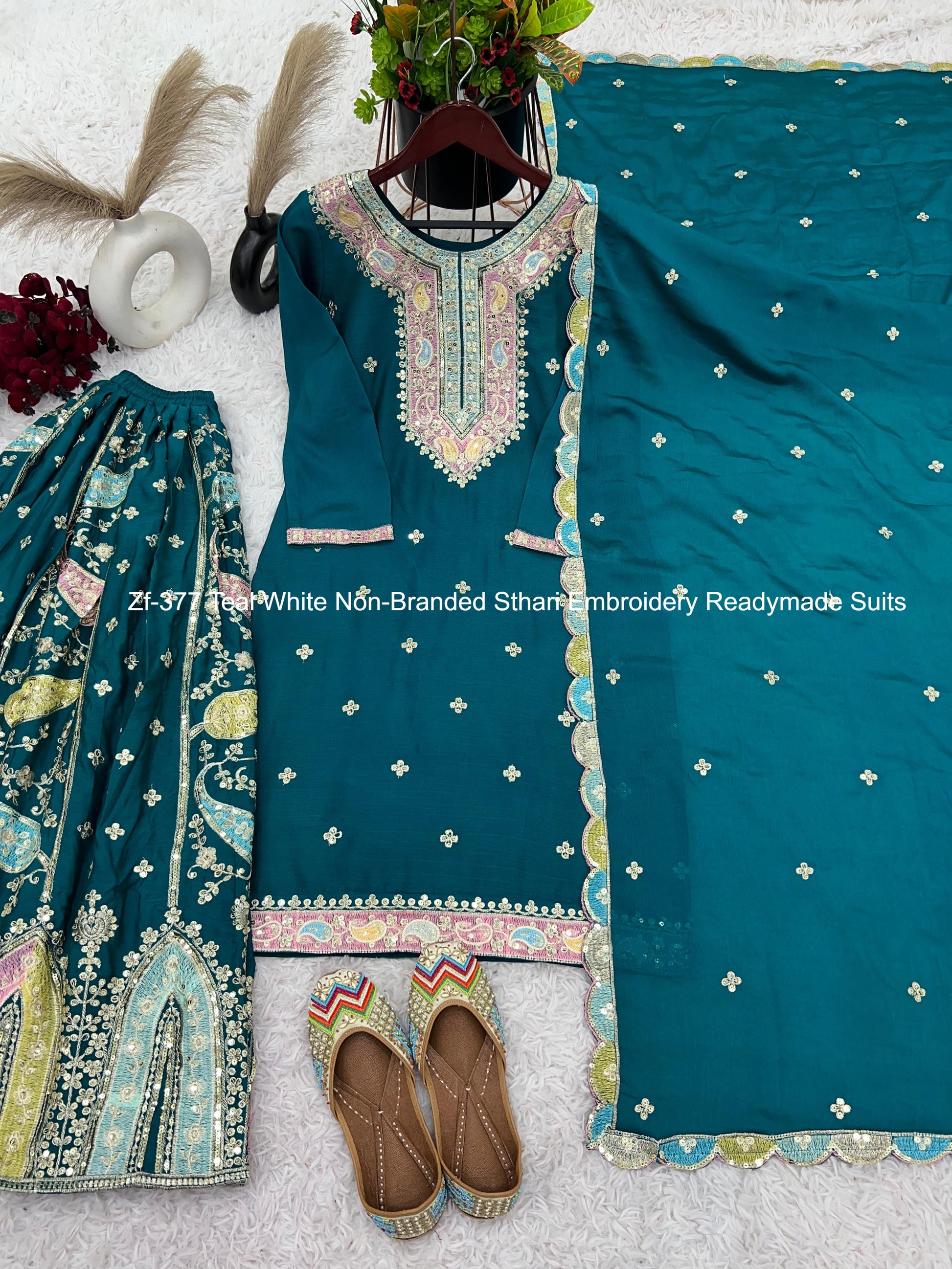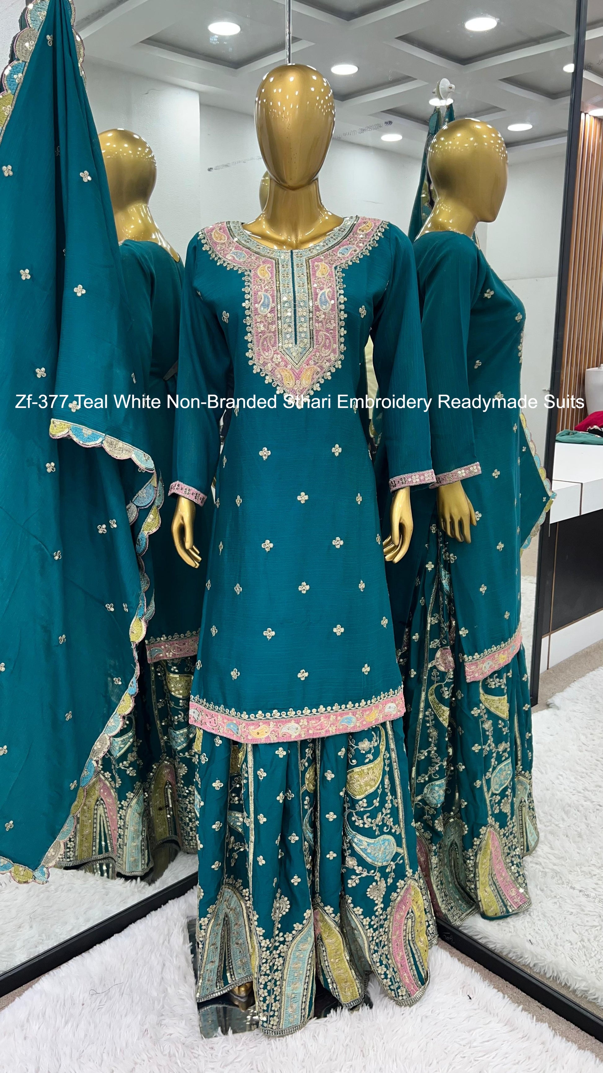 Zf-377 Teal White Non-Branded Sthari Embroidery Readymade Suits